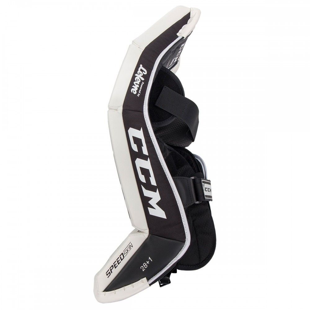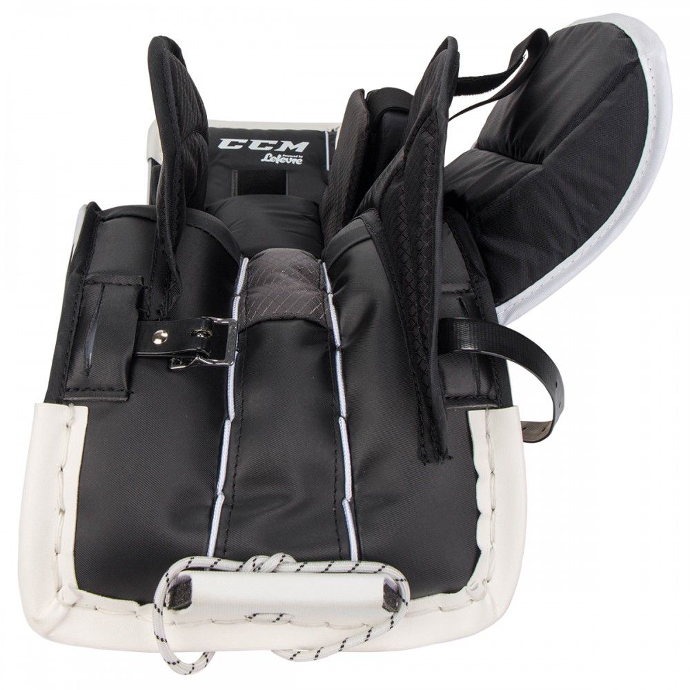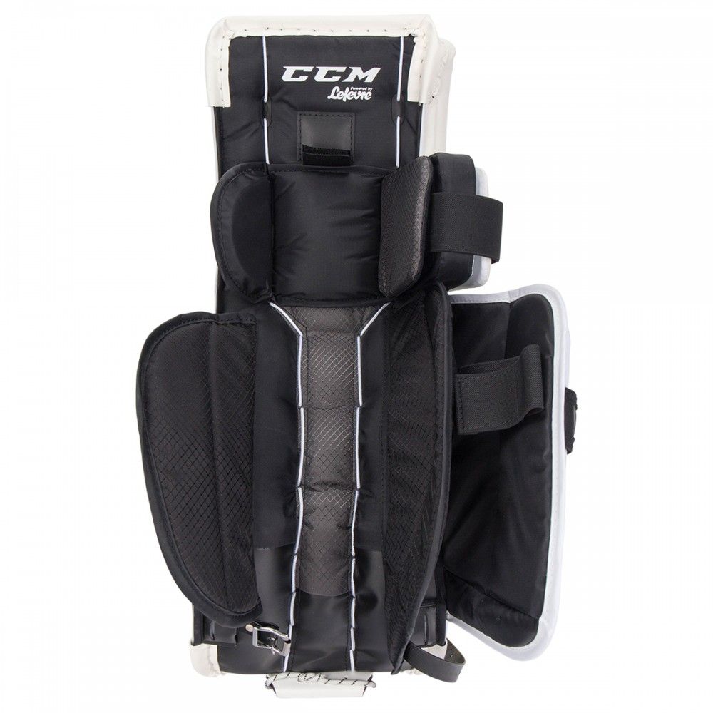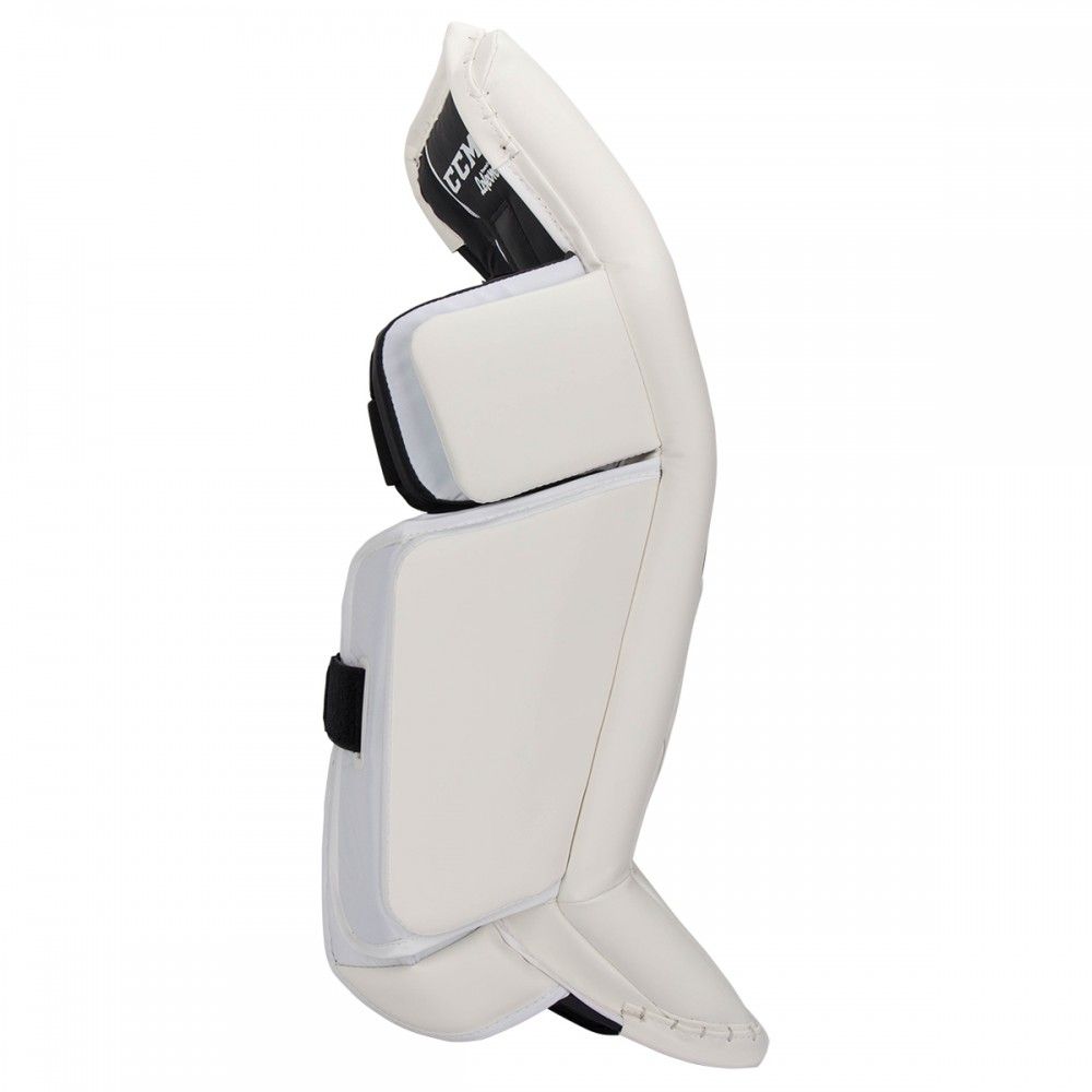 Более свободная коленная часть щитка позволяет щитку быстрее реагировать, быстрее закрывая пространство между ногами вратаря.Цельный внешний валик для максимального охвата.