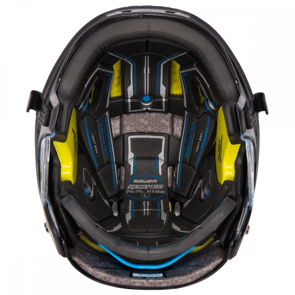 Bauer Re-Akt 200 – самый защищенный шлем в модельном рядку Bauer. Защита обеспечивается с помощью вкладыша Suspend-Tech NG, который предотвращает последствия от всех возможных типов ударов. Пены XRD и VTX обеспечивают комфортную посадку шлема и защищают от прямых ударов. FIT PLATE - термоформуемый элемент в области затылка, который поможет создать индивидуальное посадку шлема.