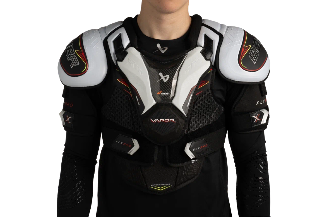 Нагрудник VAPOR FLYPRO. Плечевые накладки изготовлены из вспененного материала HYPERLITE, обеспечивающего легкую спортивную посадку, и легкого композита CURV® для оптимальной защиты от большинства физических воздействий в игре. А благодаря плавающей грудине и анатомической посадке можно оставаться быстрым, подвижным и маневренным. Дополнительная защита. Меньший вес.