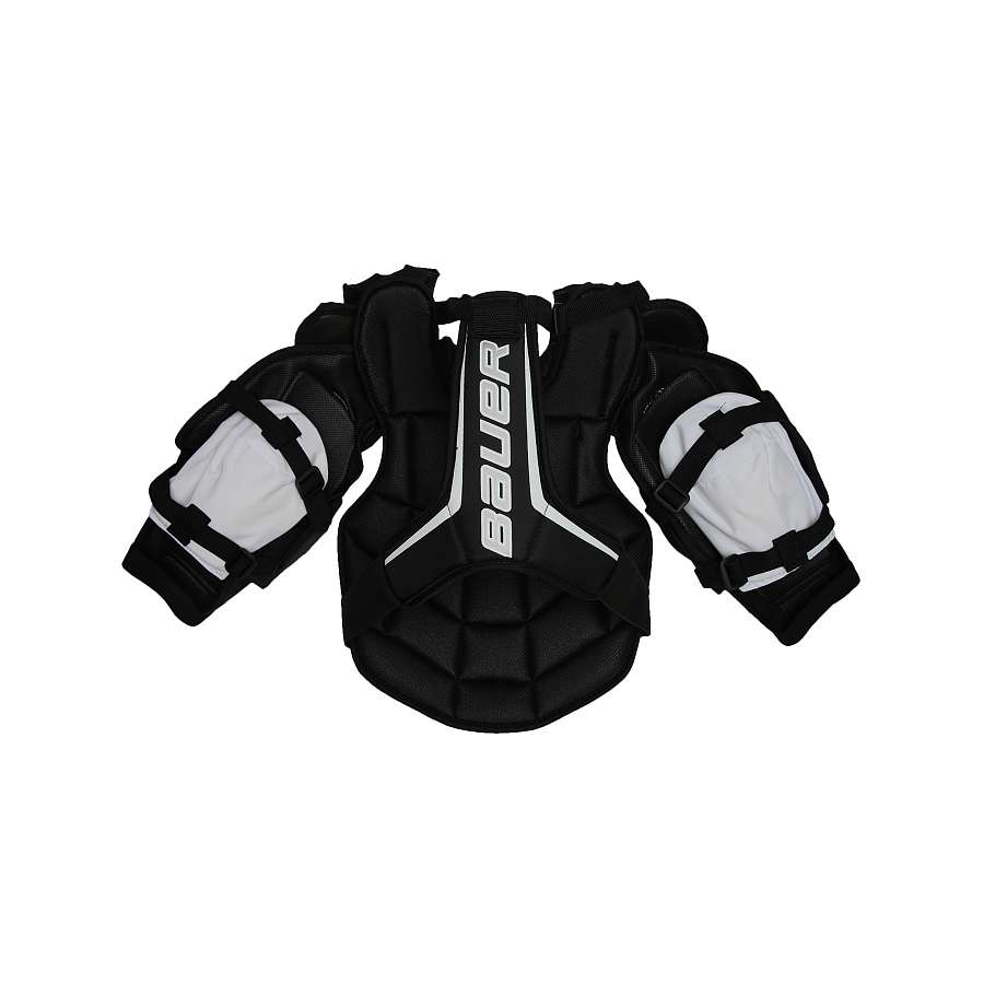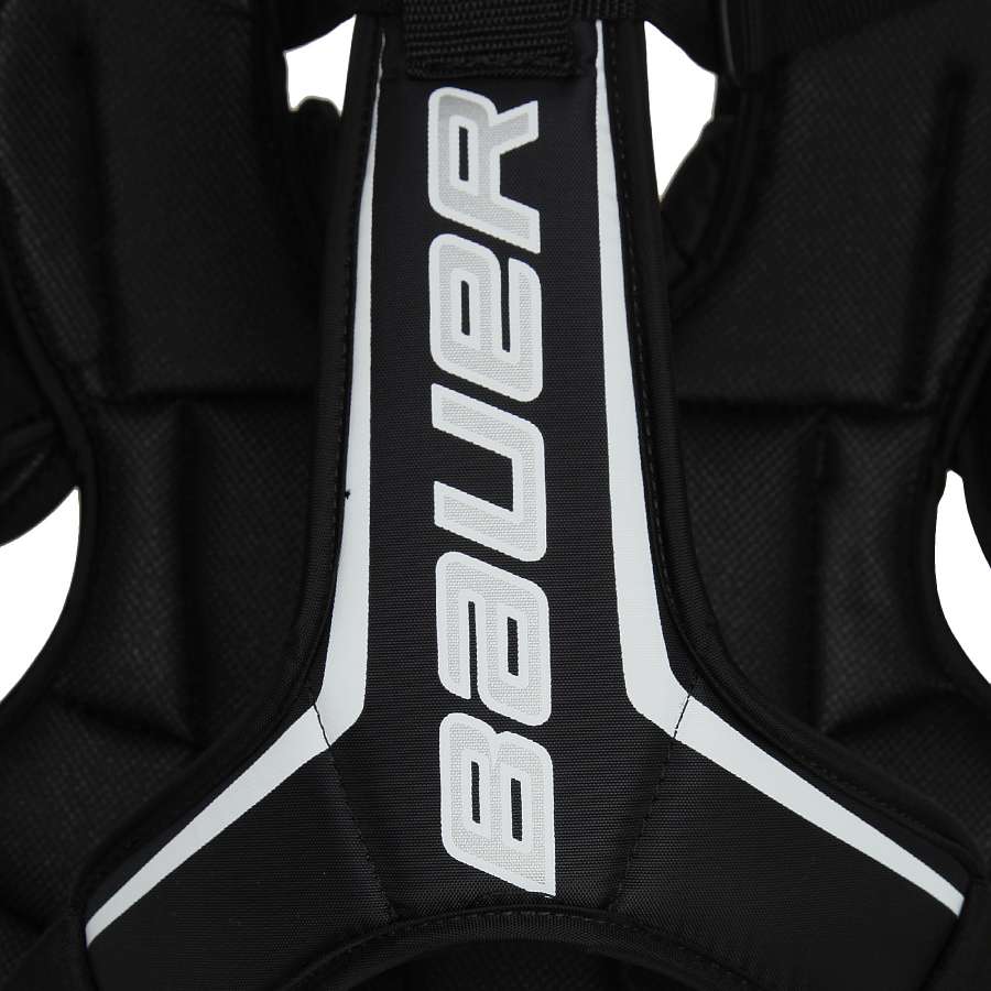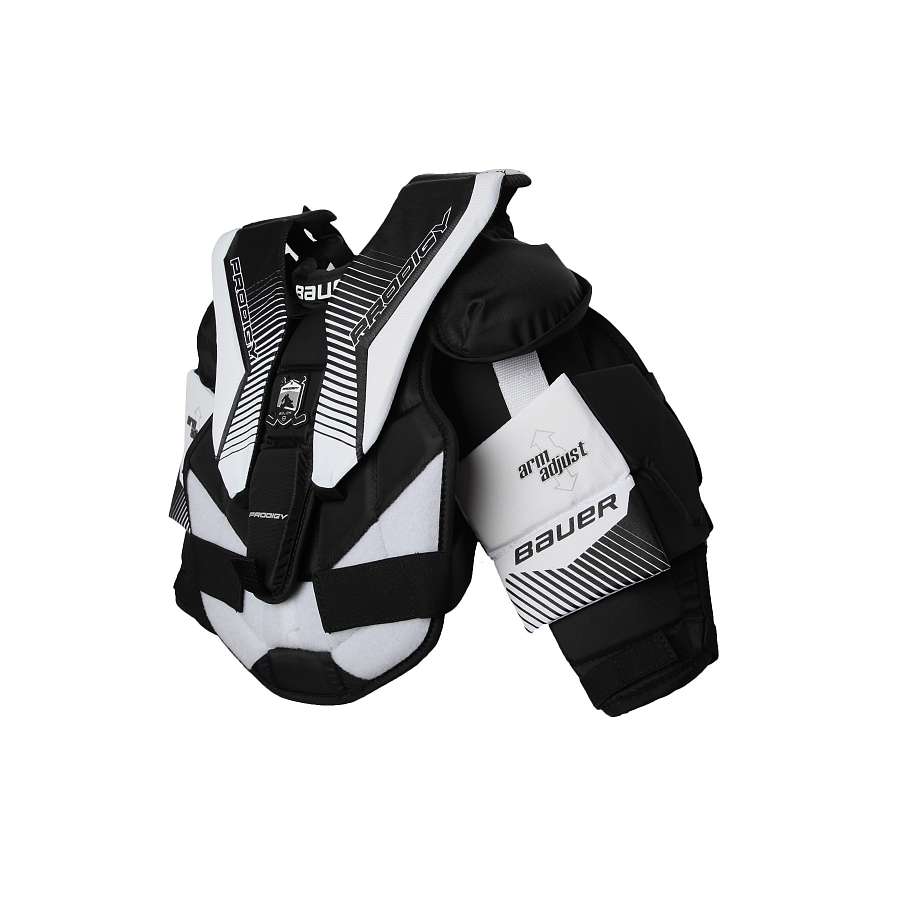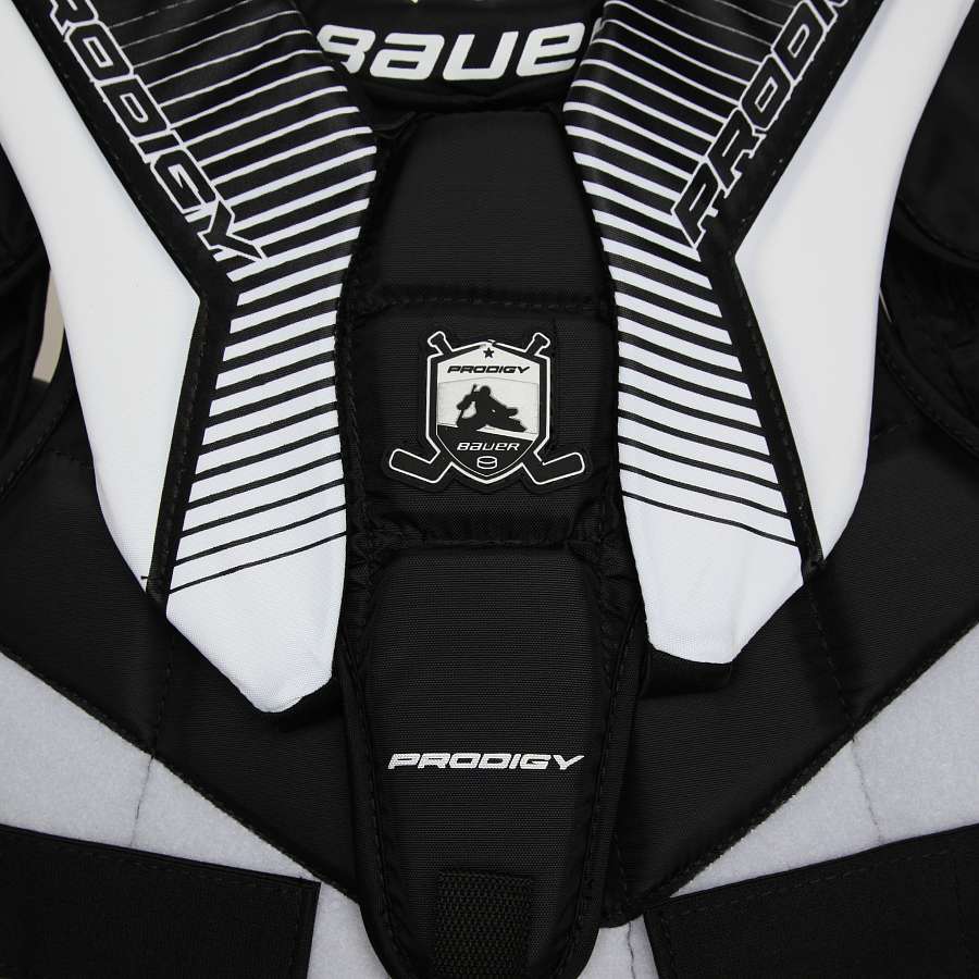Нагрудник хоккейный, вратарский BAUER PRODIGY 3.0 YTH модель сезона 2017 года создана для самых маленьких вратарей, которые только начинают свой путь в хоккее. В данной модели используются легковесные материалы, удобная и надежная конструкция. Внешнее покрытие нагрудника выполнено из высокопрочного, нейлонового материала, что гарантирует длительный срок службы защиты. В качестве внутреннего наполнения элементов защиты используется пена средней и низкой плотности и пластиковые вкладки, что создает необходимый уровень защиты. Передняя панель нагрудника имеет анатомическую конструкцию и отличается гибкостью и подвижностью. Плечевые чаши выполнены из формованного пластика и выстланы мягким вспененным материалом, что обеспечивает необходимый уровень защиты. Защита верхней части грудной клетки и область ключиц обеспечивается навесными, плавающими элементами, в которых в качестве защитного наполнения используется пена средней плотности. Область грудины имеет усиленную защиту. Защита рук имеет двухсоставную, шарнирную конструкцию с регулируемой длинной, что позволяет увеличивать длину защиты по мере того, как вратарь растет. Локтевая чаша выполнена из формованного пластика и выстлана вспененным материалом для создания надежной защиты локтевого сустава. Задняя панель имеет цельную конструкцию и обеспечивает полноразмерную защиту спины и позвоночника за счет использования в качестве наполнения пены средней плотности. Внутренняя подкладка выполнена из сетчатого материала, который способствует быстрому высыханию элементов защиты и созданию комфортных условий для маленького вратаря. Система ремней фиксации нагрудника позволяет не только удобно закрепить нагрудник на теле, но и создать плотное прилегание всех элементов защиты к телу, обеспечивая тем самым необходимую мобильность и эффективную защиту.