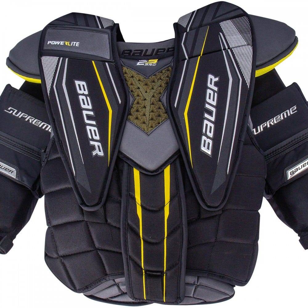 Нагрудник вратарский BAUER SUPREME 2S PRO S18 SR флагманская модель сезона 2018 года обладает высоким уровнем защиты и отличной мобильностью. Нагрудник обладает анатомической посадкой. Передняя панель имеет сегментированное строение, которое позволяет вратарю свободно и легко двигаться и сгибаться. Центральный щиток, закрывающий грудину, выполнен с использованием легкой, вентилируемой пены Vent Armor. Плавающие плечевые чаши усилены сверхлегкой пеной Power Lite, которая обладает отличными защитными свойствами и способна точно повторять анатомические контуры тела, обеспечивая комфортную посадку и точное прилегание элементов защиты. Так же данный вид пены используется в навесных, подвижных элементах, закрывающих область ключиц. Модель имеет усиленную защиту в области ребер Comfort Edge и защиту области живота, выполненную из формованной пены. В элементах защиты бицепса используется та же пена Power Lite и легкий композитный материал Curv, что создает высокий уровень защиты этой области руки. Локтевая чаша выполнена с использованием пены Poron XRD, которая максимально эффективно поглощает энергию удара, создавая отличную защиту. Защита рук имеет форму рукава и дополнительную фиксацию ремешком на липучке вокруг запястья, что позволяет защитным элементам оставаться в на месте в различных игровых ситуациях. Задняя часть нагрудника имеет цельную, расширенную конструкцию с усиливающей вставкой, закрывающей позвоночник. Материал подкладки выполнен с применением технологии 37.5, которая использует тепло тела спортсмена для ускорения процесса испарения излишков влаги. Кроме того материал подкладки обработан по технологии Sanitized, которая препятствует возникновению неприятных запахов в процессе эксплуатации нагрудника и сохраняет экипировку всегда свежей. Два эластичных ремня на спине позволяют отрегулировать плотность посадки нагрудника.