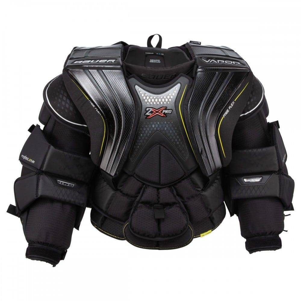 Нагрудник вратарский BAUER VAPOR 2X PRO S19 SR новинка сезона 2019, модель профессионального уровня, одна из самого совершенного и технологически продвинутого защитного снаряжения. Предлагаемая модель отличается качественной конструкцией и материалами, отличными защитными свойствами, великолепной мобильностью и сниженным весом. Материалом внешней отделки является высокопрочный нейлон, сетка и полиэстер Ripstop. Фронтальная панель нагрудника имеет мульти сегментное строение, где используются анатомически расположенные блоки, что позволяет вратарю свободно сгибаться и двигаться. Пена высокой плотности используется в передней панели в качестве амортизирующего наполнения и создает высокий уровень защиты. Центральный щиток, закрывающий грудину, дополнен вставкой Curv Composite, чтобы обеспечить дополнительную защиту для вратаря и контролировать отскок шайбы. Область плеча и ключиц закрыты дополнительными, навесными элементами с конструкцией Free Flex, которая облегчает перекрестные движения рук. Пена высокой плотности используется в данных элементах защиты. Формованные плечевые чаши выполнены из пластика и усилены пеной Aerolite. Низкий профиль позволяет вратарю свободно двигаться. Элементы, закрывающие область ключиц, имеют систему регулировки Arch Adjustment System, в которой используется липучка для более удобного расположения данных элементов на нагруднике и обеспечения полного покрытия и защиты ключицы и горла. Защита рук имеет подвижную конструкцию Dynamic 3 Flex Arm, позволяя вратарю свободно сгибать и разгибать руки без ограничений. Для защиты рук в данной модели используется пена высокой плотности, которая находится в многослойных панелях, закрывающих бицепс, локтевые суставы и предплечье. Формованный пластик используется во всех элементах защиты, закрывающих руки вратаря. Система удлинения защиты рук Extension Fit System, которая используется в данной модели, позволяет увеличить по длине или сжать защиту руки для создания идеальной подгонки нагрудника. Данная опция делает эту модель идеально подходящей для вратарей с более длинными руками и для более молодых вратарей, которые быстро растут и нуждаются в расширении своей защиты. Удлинение элементов защиты рук не влияет на длину туловища нагрудника. Защиту позвоночника обеспечивает элемент, выполненный из пены высокой плотности. Область ребер закрывается мягкими, защитными элементами. Внутренняя подкладка Thermo Core способствует быстрому испарению излишков влаги, а так же обладает хорошими дышащими свойствами, создавая тем самым комфортные условия. Кроме того подкладка имеет специальную пропитку, которая борется с возникновением неприятных запахов в процессе эксплуатации нагрудника.