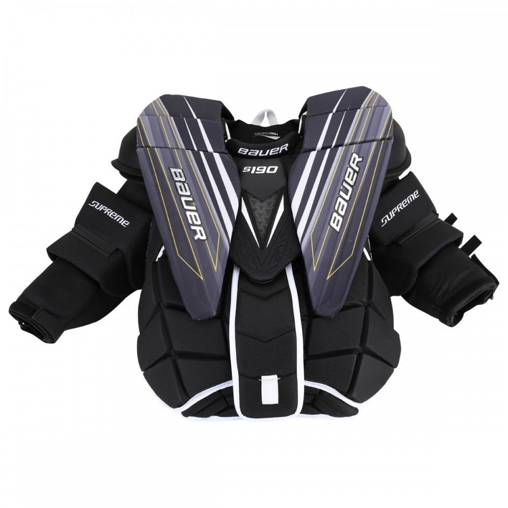 Нагрудник вратарский BAUER SUPREME S190 SR модель профессионального уровня имеет дизайн НХЛ с максимальным охватом и эффективной защитой. В качестве внешнего покрытия используется высокопрочный, стойкий к истиранию нейлон. Благодаря мультипанельной и сегментированной конструкции передней части нагрудника вратарь имеет возможность двигаться максимально быстро, легко сгибаться. Внутреннее наполнение элементов защиты выполнено с использованием пены высокой плотности, которая расположена в стратегически важных местах, и пены низкой плотности. Центральный щиток, закрывающий грудину, выполнен из вентилируемой пены Vent Armor. Область плеча и ключиц закрыта дополнительными, навесными элементами. Края навесных, подвижных элементов, закрывающих область ключиц и плеч, выполнены с применением технологии Free Flex, которая способствует приданию защите максимальной мобильности. Плечевая чаша имеет расширенную конструкцию, обеспечивая эффективную защиту плеча. Элементы защиты бицепса и руки имеют квадратную конструкцию, которая обеспечивает максимальное покрытие и защиту. Защита локтевых суставов обеспечивается пеной XRD. Область ребер имеет защиту Comfort Edge. С внутренней стороны нагрудник выстлан подкладкой из синтетического материала, который быстро высыхает, облегчая нагрудник, и обеспечивает комфортное состояние для тела на протяжении всей игры. Задняя, цельная часть нагрудника обеспечивает расширенное покрытие и надежную защиту спины в целом и позвоночника. Регулируемый ремень позволяет быстро зафиксировать нагрудник.