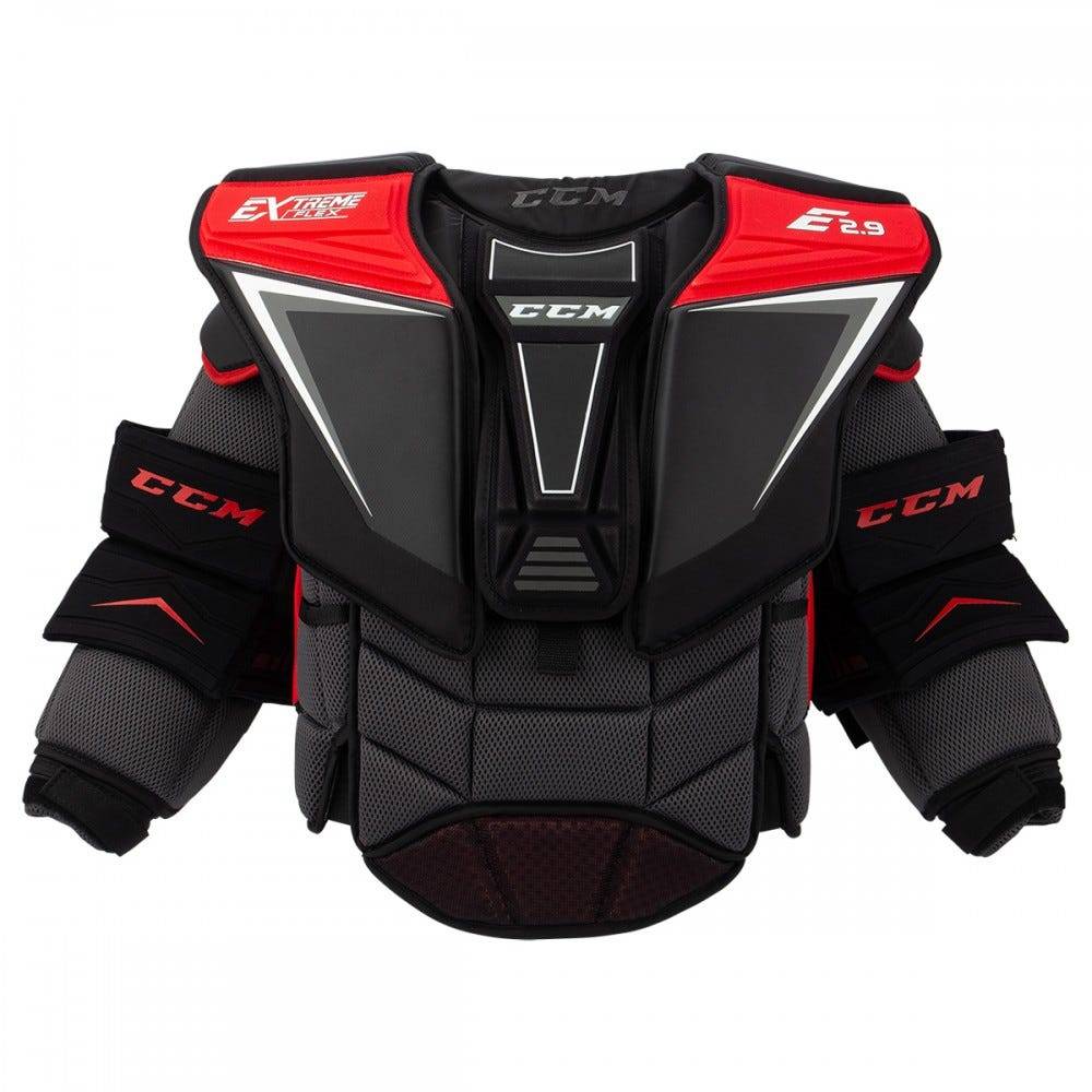 Нагрудник вратарский CCM EXTREME FLEX SHIELD E2.9 SR модель полупрофессионального уровня создана для подвижных и динамичных вратарей, обладает максимальной мобильностью и отличными защитными функциями. Передняя панель оснащена регулируемыми, сегметированными элементами защиты плеча и ключичной области, независимыми элементами защиты локтя и съемными элементами защиты ребер для создания действительно индивидуальной подгонки нагрудника. По сравнению с линейкой Premier, данная модель отличается более контурной посадкой и более сегментирована для обеспечения большей подвижности вратаря и лучшего прилегания элементов защиты к телу. В качестве защитного, амортизирующего наполнения в элементах защиты используется пена высокой плотности и пластиковые вкладки, которые усиливают защиту. Центральный щиток, закрывающий грудину, выполнен из формованной пены высокой плотности с пластиковыми вкладками, усиливающими защиту. Формованные плечевые чаши выполнены из пены высокой плотности и покрыты кожей, которая увеличивает прочность и долговечность защиты. Система быстрого крепления элементов защиты плеча и ключичной области обеспечивает настраиваемую и удобную посадку этих элементов. Налокотники имеют квадратный дизайн, который создает максимальное покрытие в области локтевого сустава. Формованная пена PE в элементах защиты обеспечивает им максимальную гибкость и способствует эффективному рассеиванию энергии удара и созданию надежной защиты. Независимо регулируемый элемент защиты локтевого сустава позволяет получить индивидуальную подгонку этого элемента. Задняя панель имеет усиленный элемент защиты позвоночника с расширенным дизайном и усиливающей пластиковой вкладкой. Два регулируемых ремня позволяют надежно зафиксировать нагрудник на теле вратаря.