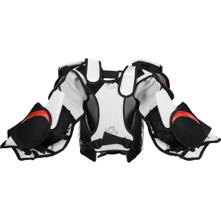 Увеличенные протекторы плеча надежно защищают вратаря и надежнее прикрывают ворота.Трехслойная конструкция нагрудникаотличается гибкостью и надежно снижает силу удара шайбы.Протектор живота обеспечивает защиту даже если вратарь согнулся вперед.Увеличенные наплечные чашечки, регулируемые боковые протекторы груди, анатомическая форма протекторов рук нескользят, увеличенные протекторы бицепсов.Составной протектор груди с гибкой вставкой внизу живота.Свобода и быстрота движений благодаря сниженному весу.Зауженные к запястью налокотники облегчают работу с блокером и ловушкой.