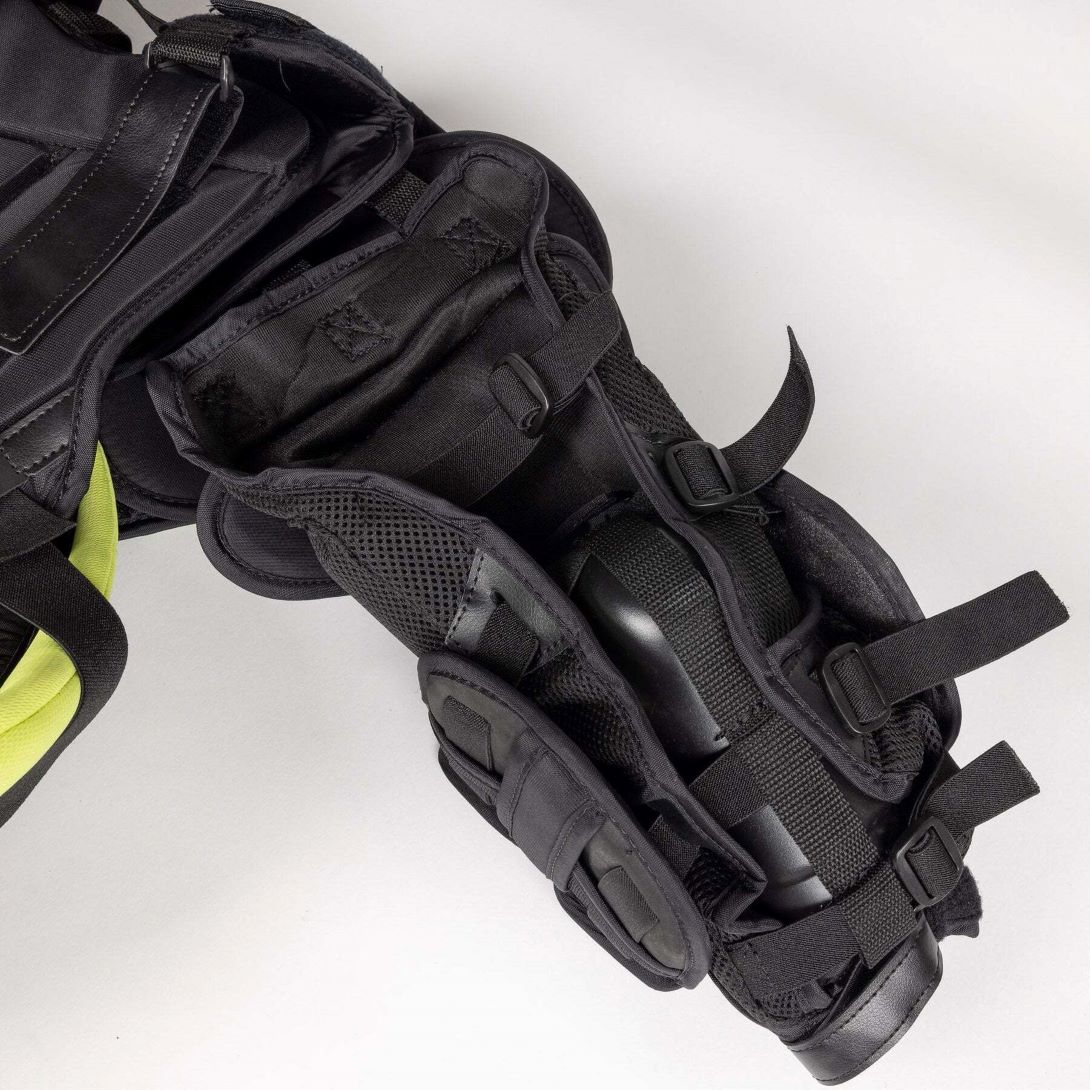 Защита оснащена легко регулируемыми шнуровкой рукавами и съемными дополнительными накладками на грудь и боковыми накладками.