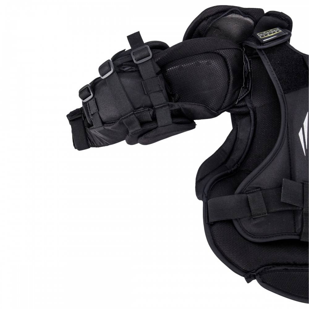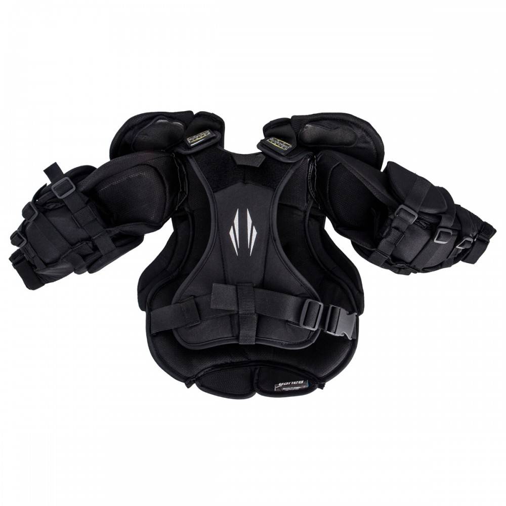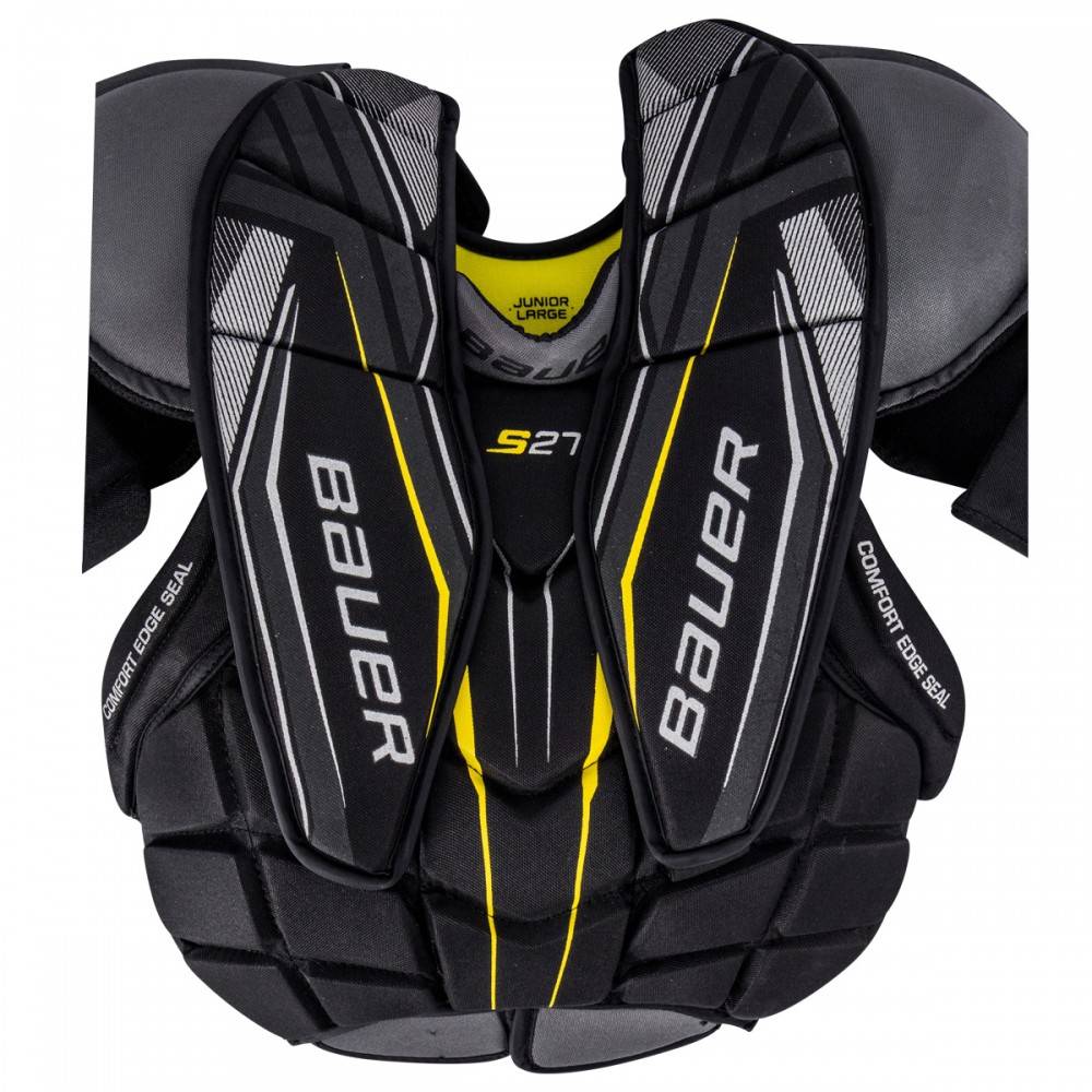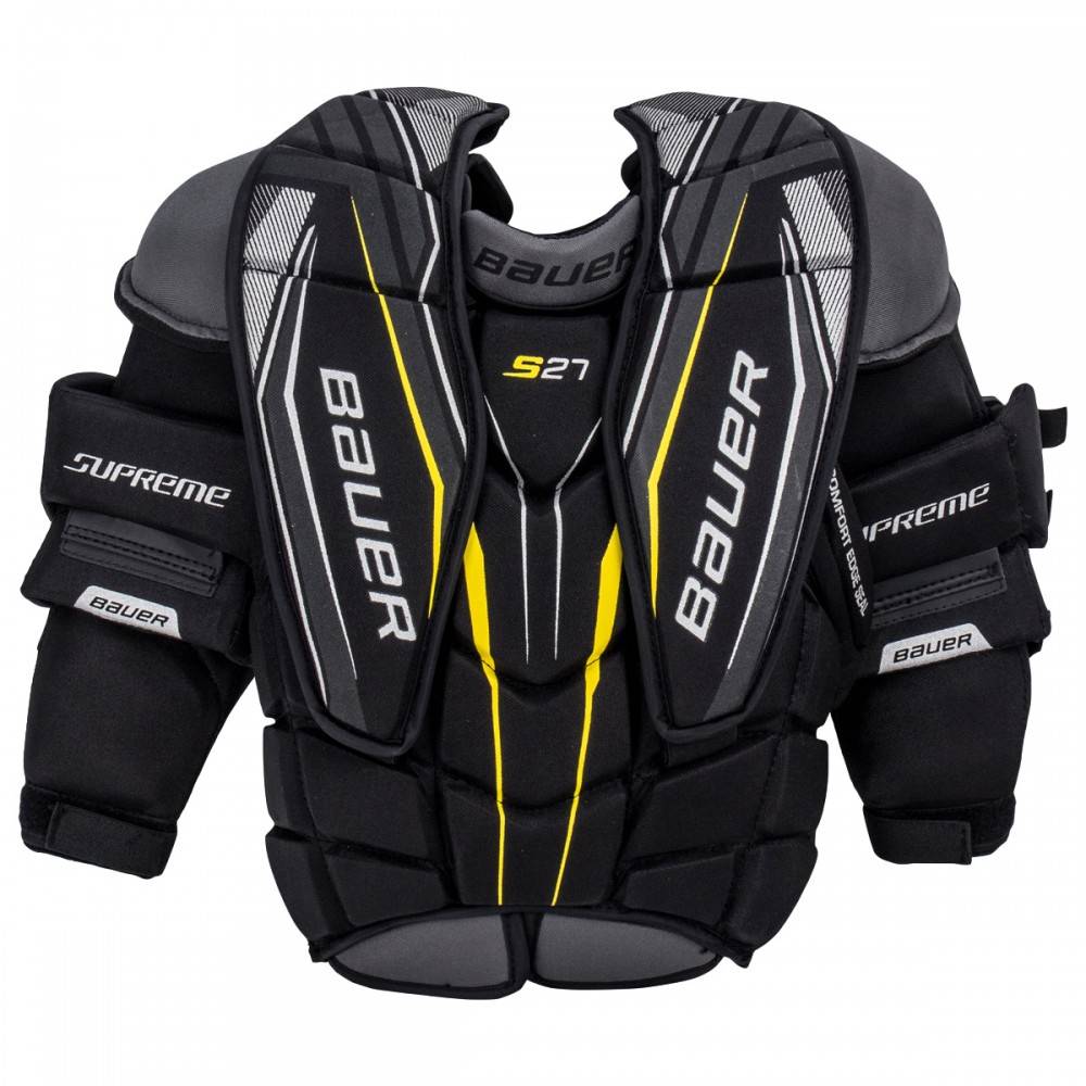 Нагрудник вратарский BAUER SUPREME S27 JR юношеская модель, новинка сезона 2018 года создана для вратарей, которые только начинают свой путь в хоккее. Передняя часть нагрудника имеет мультипанельную и сегментированную конструкцию, которая дает возможность вратарю двигаться максимально быстро и легко. Внешняя отделка нагрудника выполнена из прочного нейлона. Внутреннее наполнение элементов защиты выполнено с использованием амортизирующей пены, которая эффективно защищает тело вратаря. Плавающая защита плеча немного уменьшена в ширине и округлена, что дает вратарю дополнительную мобильность без ущерба для защиты. Плечевые чаши усилены пеной средней плотности. В области шеи есть два регулируемых эластичных ремня, которые можно затянуть или ослабить, чтобы обеспечить определенную посадку вокруг шеи вратаря. Защита рук и плеч выполнена из легкой пены и обладает высокими защитными свойствами. Навесные, подвижные элементы, закрывающие область ключиц и плеч способствует приданию защите максимальной мобильности. Задняя часть нагрудника имеет цельную, расширенную конструкцию с усиливающей вставкой, закрывающей позвоночник. Внутренняя подкладка выполнена из износостойкого материала.