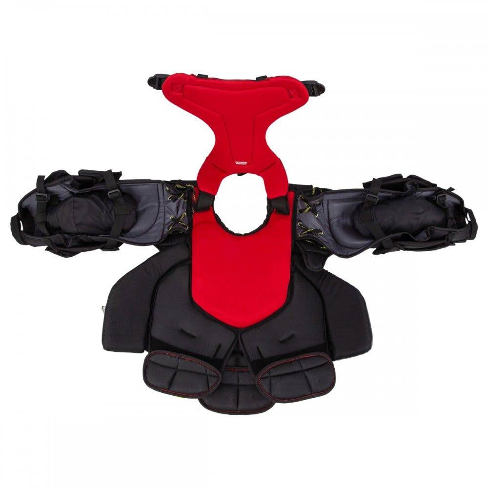 Нагрудник вратарский BAUER VAPOR X2.9 S19 JR юношеская модель для вратарей, играющих на профессиональном уровне. Новинка сезона 2019 года отличается высоким уровнем защиты и хорошей мобильностью. Внешняя отделка нагрудника, выполненная из нейлона, сетки и полиэстера, обладает отличной прочностью и хорошей воздухопроницаемостью. Фронтальная панель разделена на сегменты, что делает нагрудник подвижным. В качестве защитного наполнения во фронтальной панели используется пена высокой плотности, которая создает высокий уровень защиты. Навесные элементы обеспечивают дополнительную защиту области плеча и ключиц. Конструкция Free Flex лучшую мобильность и улучшает перекрестные движения рук. В данных элементах защиты так же используется пена высокой плотности, которая отлично амортизирует удары. Элементы, закрывающие область ключиц, имеют систему регулировки Arch Adjustment System, в которой используется липучка для более удобного расположения данных элементов на нагруднике и обеспечения полного покрытия и защиты ключицы и горла. Налокотники в данной модели стали более мобильными благодаря конструкции Dynamic 3 Flex Arm, которая представляет собой литую локтевую, пластиковую чашу, состоящую из трех частей и движущуюся вместе с рукой. Для защиты рук в данной модели используется пена высокой плотности, которая находится в многослойных панелях, закрывающих бицепс, локтевые суставы и предплечье. Элементы защиты в налокотниках усилены пластиковыми вкладками. Кроме того в данной модели нагрудника используется система удлинения налокотников Extension Fit System, которая позволяет удлинить или сжать защиту руки для создания идеальной подгонки нагрудника. Такая возможность делает нагрудник идеально подходящим для молодых вратарей, которые быстро растут и нуждаются в удлинении своей защиты. Удлинение налокотников не влияет на длину туловища нагрудника. Защиту позвоночника обеспечивает элемент, выполненный из пены высокой плотности. Область ребер закрывается мягкими, защитными элементами. С внутренней стороны нагрудник имеет покрытие ThermoMax, которое выполнено из износостойкой микрофибры. Материал подкладки способствует быстрому испарению излишков влаги, а так же обладает хорошими дышащими свойствами, создавая тем самым комфортные условия.