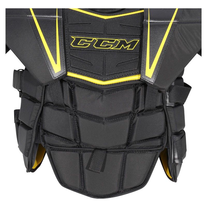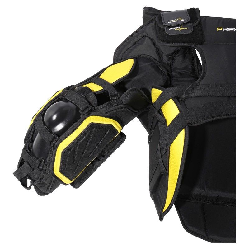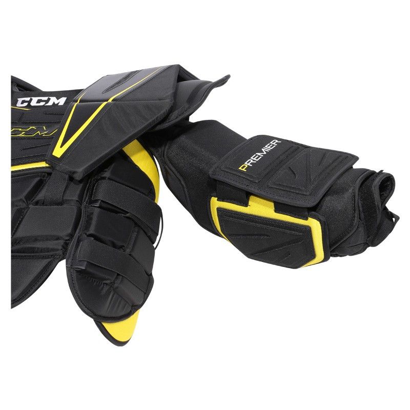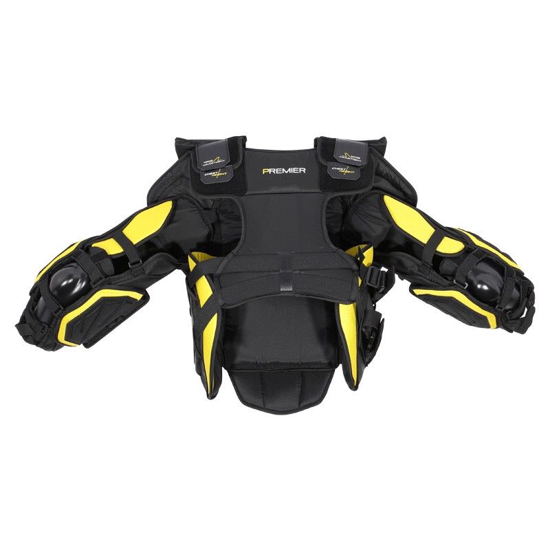 Высокопроизводительная "умная" пена D3O® в области груди нового панциря вратаря CCM Premier обеспечивает максимальную защиту, сохраняя эластичность.Новый дизайн защиты бицепса и предплечья оснащена специальными воздушными каналами, которые гарантируют хорошую циркуляцию воздуха.Быстрая регулировка Quick Release Velcro для удобной подгонки.Защита груди с использованием вспененного полиэтилена для дополнительной защиты и уменьшения отскоков.
