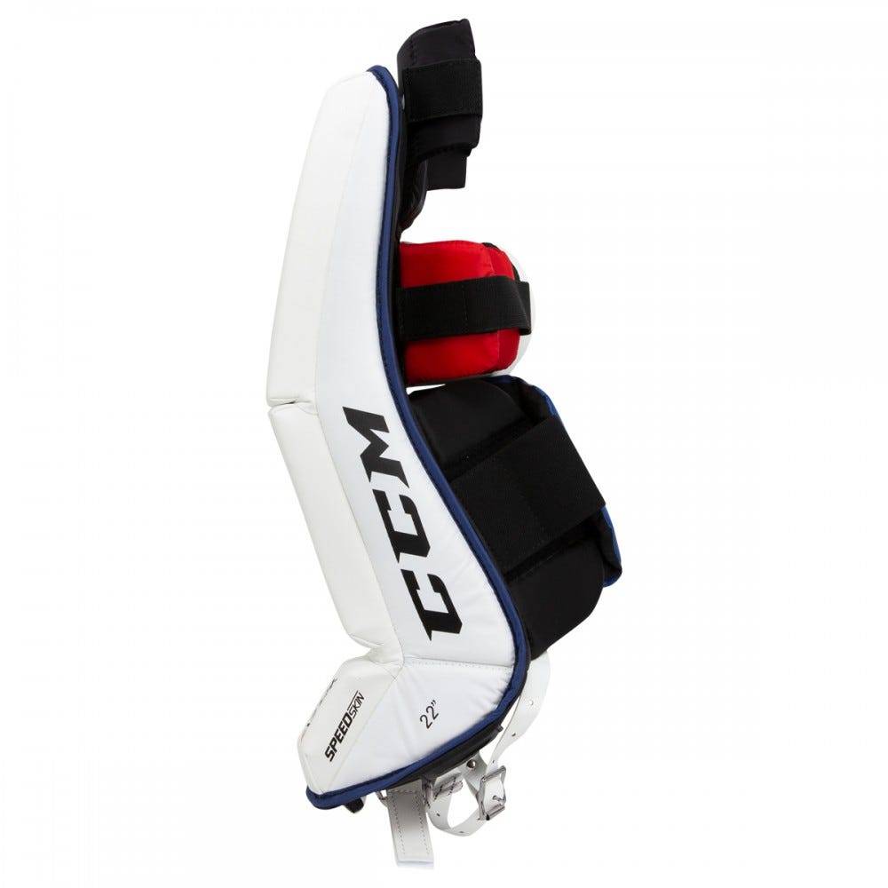Щитки этой модели созданы для самых маленьких вратарей, которые только начинают осваивать стиль «бабочка». Плоская конструкция фронтальной поверхности обеспечивает максимальное покрытие, защиту и предсказуемый отскок шайбы. Внешняя отделка щитков выполнена из высокопрочного нейлона и полиэстера. Применяемая технология SpeedSkin позволяет щиткам легко скользить на льду при переходе в позицию бабочка.В качестве защитного, амортизирующего наполнения во фронтальной части щитков используется пена высокой и низкой плотности, что позволяет снизить вес щитков и улучшить их сбалансированность.Защита бедра имеет регулируемую конструкцию. Посадочное место под колено так же имеет регулируемую конструкцию, что позволяет подобрать удобную и точную посадку этого защитного элемента и обеспечивает надлежащий охват в области колена.Щиток, закрывающий икроножную мышцу, выполнен из пены средней плотности и покрыт более мягкой пеной, которая уменьшает трение защиты об ногу вратаря при переходе в позицию бабочка.Канал для ноги имеет тонкий профиль и позволяет быстрее перейти в позицию бабочка. Система фиксации щитков ССМ была оптимизирована для сокращения времени одевания и позволяет быстро и легко регулировать посадку щитков прямо на льду. В систему обвязки входит специальная стяжка, которая легко крепится к коньку с помощью крепления на липучке и помогает щитка оставаться плотно прилегающими к конькам, но при этом сохраняет их гибкость при переходе в бабочку.