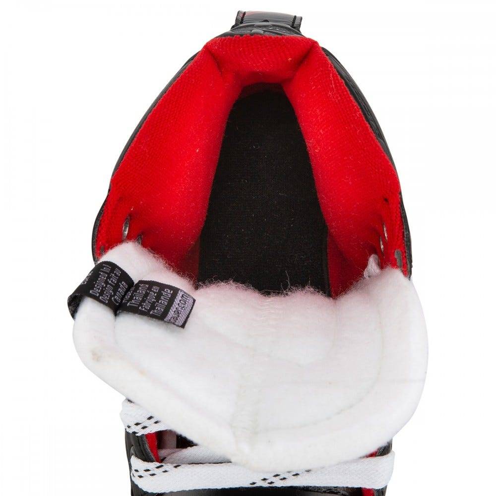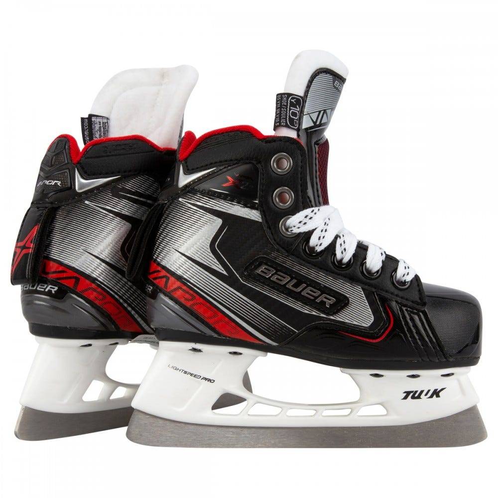 Коньки вратарские BAUER VAPOR X2.7 S19 YTH детская модель начального уровня, новинка сезона 2019 года обеспечивает мобильность и комфорт, сохраняя при этом высокие защитные свойства. Корпус ботинок имеет внешнее покрытие, выполненное из материала 3D Tech PU. Внутренний язычок, состоящий из двух частей и имеющий войлочную футеровку, плотно охватывает переднюю часть голеностопного сустава, повторяя его контуры и создавая плотное и комфортное прилегание и защиту от передавливания шнуровкой. Материал внутренней подкладки плотно фиксирует стопу внутри ботинка, предотвращая любое ее смещение и позволяя более эффективно передавать усилие при движении, а так же поглощает влагу, сохраняя ноги сухими на протяжении всей игры. Внутренняя стелька способствует комфортному положению стопы внутри ботинка. Мягкая набивка в области лодыжки, выполненная из пены с эффектом памяти плотно фиксирует ногу в ботинке. Ботинок имеет усиленный мысок, создающий высокий уровень защиты, что позволяет удалить традиционный обтекатель на стакане, и в свою очередь, способствует снижению общего веса коньков. Подошва выполнена из термопластичной резины. К ботинкам приклепаны стаканы Vertexx Edge, которые имеют увеличенную на 5 мм высоту, что позволяет обеспечить оптимальный угол атаки. Лезвия LS1G +, установленные в стаканах, выполнены из высококачественной стали, отлично держат заточку и способствуют более эффективной передаче энергии.