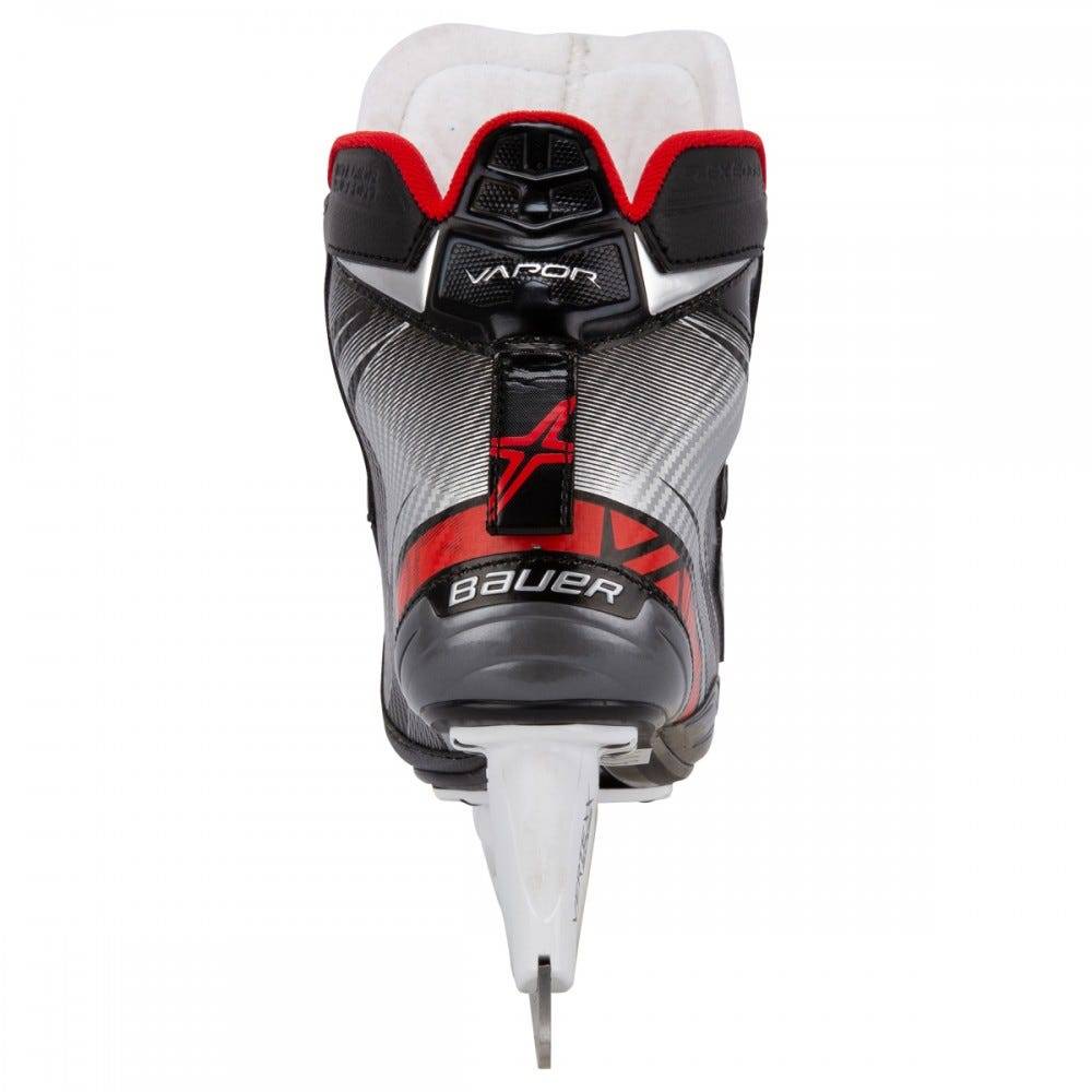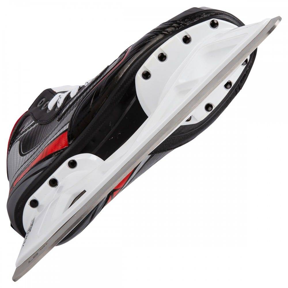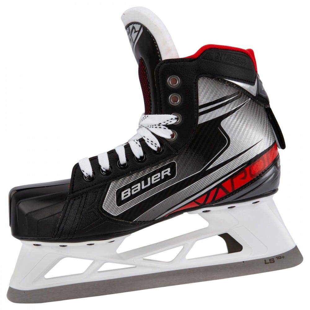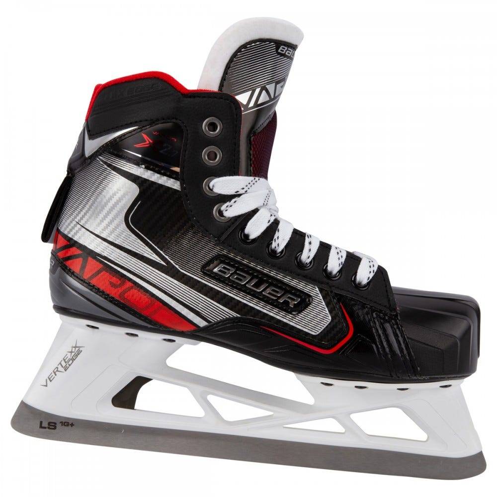 Коньки вратарские BAUER VAPOR X2.7 S19 JR юношеская модель начального уровня, новинка сезона 2019 года. Внешняя отделка корпуса ботинок выполнена из нового материала 3D Tech PU, обладает высокой прочностью и стойкостью к механическим воздействиям. Внутренний язычок, имеющий двухсоставную конструкцию и войлочную футеровку, покрывает переднюю часть голеностопного сустава, повторяя его контуры и создавая плотное и комфортное прилегание и защиту от передавливания шнуровкой. Так же язычок снабжен встроенной защитой плюсневой кости. Внутренняя стелька способствует комфортному положению стопы внутри ботинка. Внутренняя подкладка из микрофибры обладает хорошим сцеплением, плотно фиксируя стопу, предотвращая любое ее смещение и позволяя более эффективно передавать усилие при движении, а так же способствует плотной и точной подгонке ботинка по ноге. Мягкая набивка в области лодыжки, выполненная из пены с эффектом памяти плотно фиксирует ногу в ботинке. Усиленный мысок, создающий высокий уровень защиты, позволяет удалить традиционный обтекатель на стакане, и способствует снижению общего веса коньков. Подошва этой модели производится из легкой термопластичной резины. На коньках установлены стаканы Vertexx Edge, которые имеют увеличенную высоту на 5 мм, что позволяет обеспечить оптимальный угол атаки. Система Trigger system дает возможность быстро заменить поврежденное или поломанное лезвие в стакане. Лезвия LS1G +, установленные в стаканах, выполнены из высококачественной стали, отлично держат заточку и способствуют более эффективной передаче энергии.