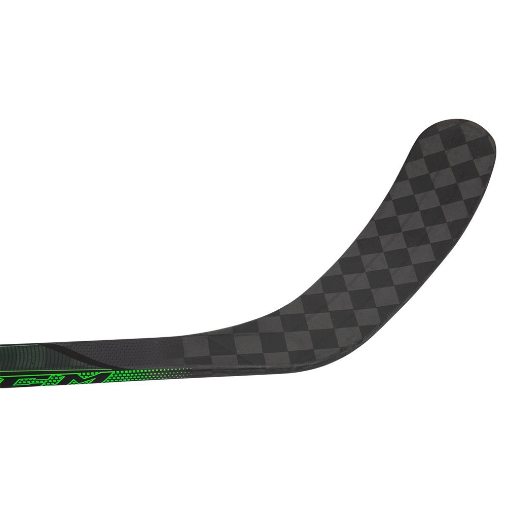 Труба / Shaft: новая улучшенная геометрия трубы отличается в каждой трети шафта. Верхняя часть имеет вогнутую с обеих сторон форму для комфорта хвата и большего контроля; средняя часть имеет вогнутую заднюю и прямую переднюю стороны для максимальной ловкости в обращении с клюшкой; нижняя часть шафта с вогнутой передней стороной и выпуклой задней увеличивает торсионную жесткость клюшки, улучшает контроль шайбы и точность броска. Технология NANOLITE CARBON LAYERING позволяет снизить вес клюшки без ущерба прочности и долговечности. А плетение углеродного волокна Sigmatex® Spread Tow гарантирует упругость клюшки и улучшенное соотношение прочности к весу.