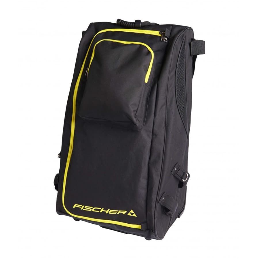 Данная модель сумки баула предназначена для удобной транспортировки хоккейной амуниции, сумка рассчитана для взрослых спортсменов. Модель имеет однотонную черную расцветку и декорирована яркими элементами желтого цвета, что придает изделию спортивный внешний вид. Сумка украшена логотипом производителя. Для транспортировки в руках сумка имеет пару удобных ручек которые прочно фиксируются на сумке, что обеспечивает высокую грузоподъемность. На одной из ручек имеется соединительный элемент, который позволяет скрепить ручки вместе. На боках имеются небольшие ручки, которые облегчают извлекание сумки из багажного отделения. Для передвижения по ровным поверхностям имеется два удобных колеса из прочного материала. Пространство вокруг колес защищено пластиковыми накладками, что защищает сумку от повреждений. Модель имеет телескопическую ручку, при помощи которой обеспечивается транспортировка на колесиках, для удобства ручка имеет регулировку высоты. Модель имеет большое центральное отделение, которое закрывается при помощи клапана с застежкой молнией. Внутри отделения имеется небольшой кармашек в котором можно хранить документы или ценные вещи. Модель имеет боковые карманы, которые так же закрываются при помощи молний.