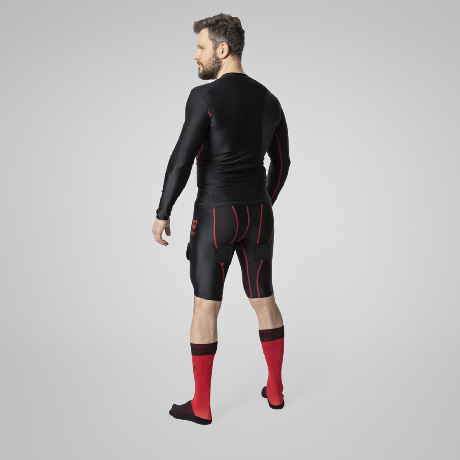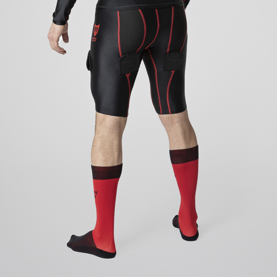 Бандаж-шорты MAD GUY Pro Compression с защитой паховой области и липучками для фиксации гамаш. Модель имеет плотную посадку и создает необходимую компрессию, в результате чего обеспечивает необходимую поддержку мышц, улучшает кровоток, снижает усталость и повышает выносливость, способствует быстрому восстановлению мышц после интенсивных физических нагрузок. При производстве применяется современная трикотажная ткань, которая придает изделию высокие эксплуатационные характеристики, прочность и износостойкость, материал хорошо держит форму и не деформируется. Не ограничивает движений, обладает высокой стойкостью к истиранию, не травмирует кожный покров, отличается хорошей воздухопроницаемостью, обеспечивая комфортный микроклимат внутри изделия. Для дополнительной вентиляции имеются вставки из сетчатого материала. Ударопрочная защитная раковина с мягкими силиконовыми краями гарантирует надежную защиту паховой области. Удобные липучки, расположенные над коленями на штанинах, позволят надежно зафиксировать гамаши.