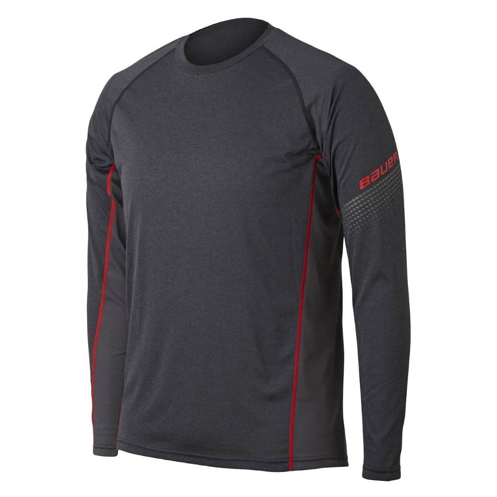 Взрослая модель. Белье футболка BAUER ESSENTIAL LONG SLEEVE BASE LAYER TOP S19 SR используется как базовый слой одежды, обладает комфортной посадкой, не мешает движениям. Футболка имеет удобные, втачанные рукава. Футболка выполнена из 100% полиэстера и быстро отводит от тела излишки влаги и тепла, обеспечивает отличную вентиляцию и комфортные условия для тела. Непосредственно в материал футболки интегрирована технология Sanitized, которая предотвращает образование бактерий, вызывающих эти неприятные запахи. Благодаря этой удивительной технологии, которая никогда не вымывается в процессе стирки, футболка всегда будет сохранять свежеть. Расположенные под руками в рукавах клинья обеспечивают максимальную свободу движений. Сетчатая панель на задней полочке увеличивает воздухопроницаемость изделия. Плоские швы, стачивающие детали кроя, не травмируют кожный покров. Ворот мягко охватывает шею.