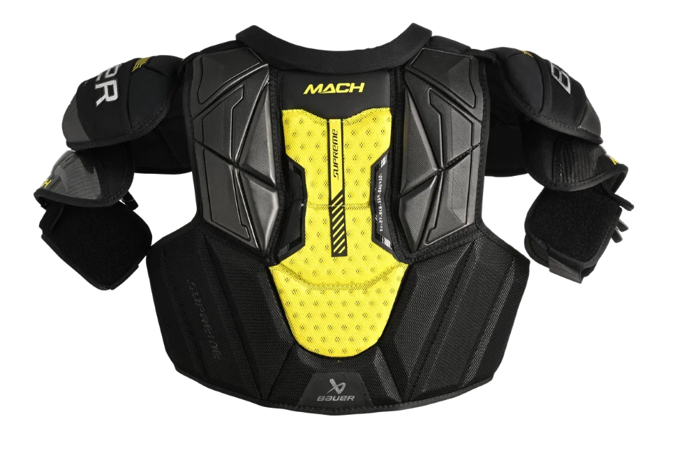 Нагрудник MACH, созданный на платформе с системой AMP, способен приспосабливаться к движениям игрока и дополнен ЗАЩИТОЙ ДЛЯ БИЦЕПСОВ и щитком CURV COMPOSITE в области грудины. Нагрудник оснащен СЕГМЕНТИРОВАННОЙ ЗАЩИТОЙ ПОЗВОНОЧНИКА С ПЕНОЙ VENT ARMOR.