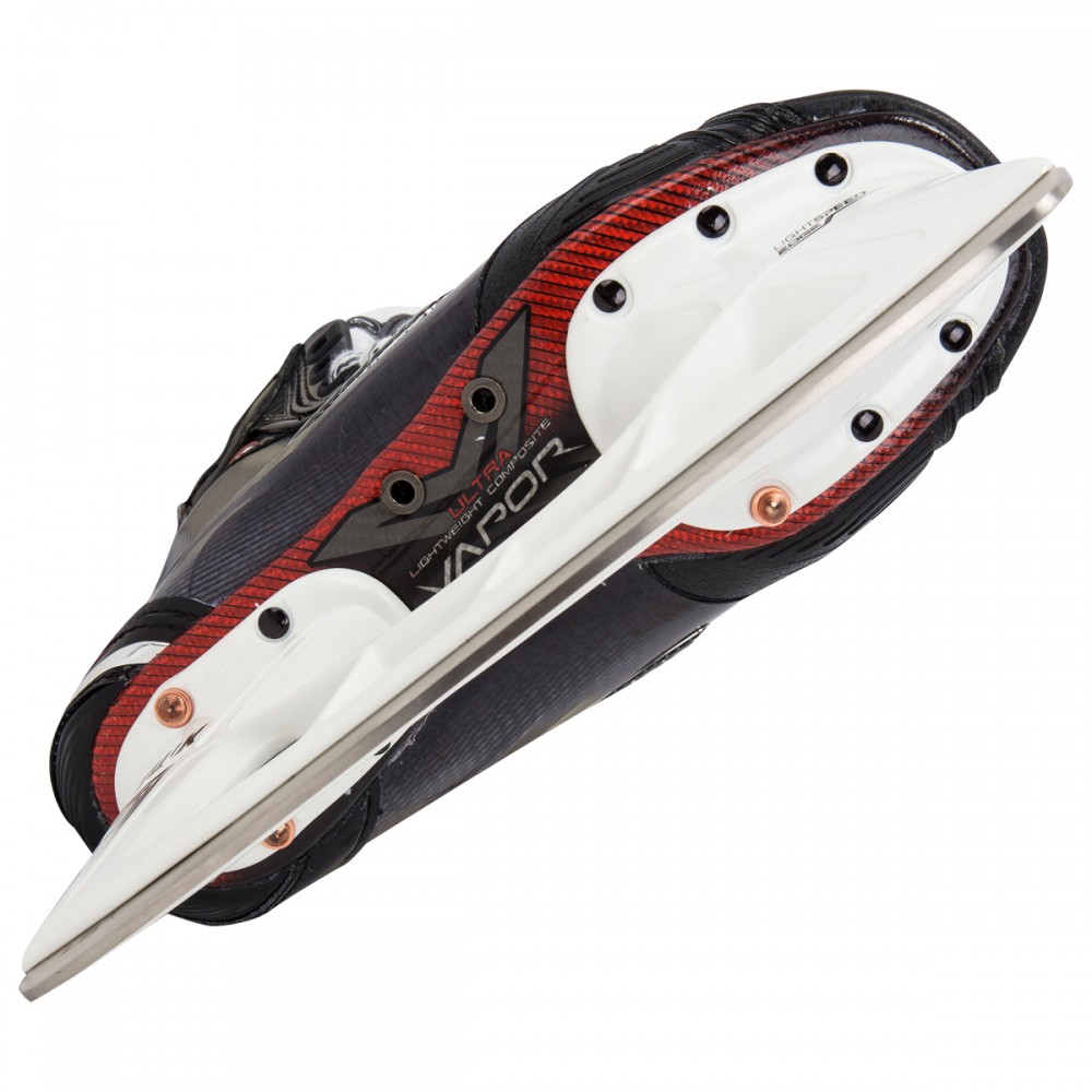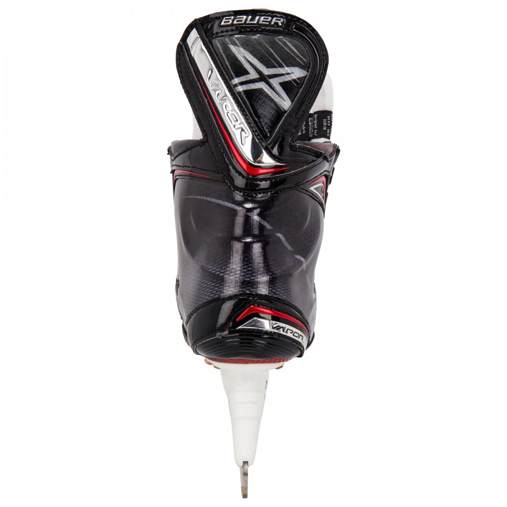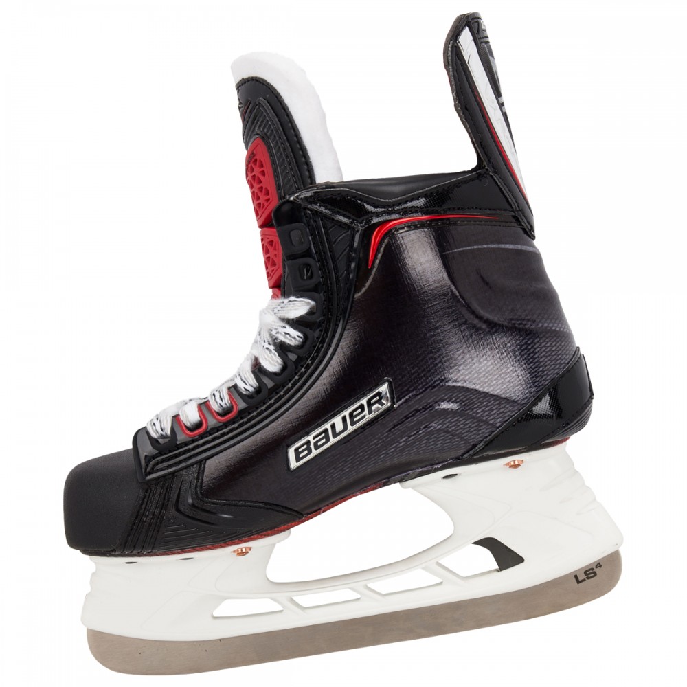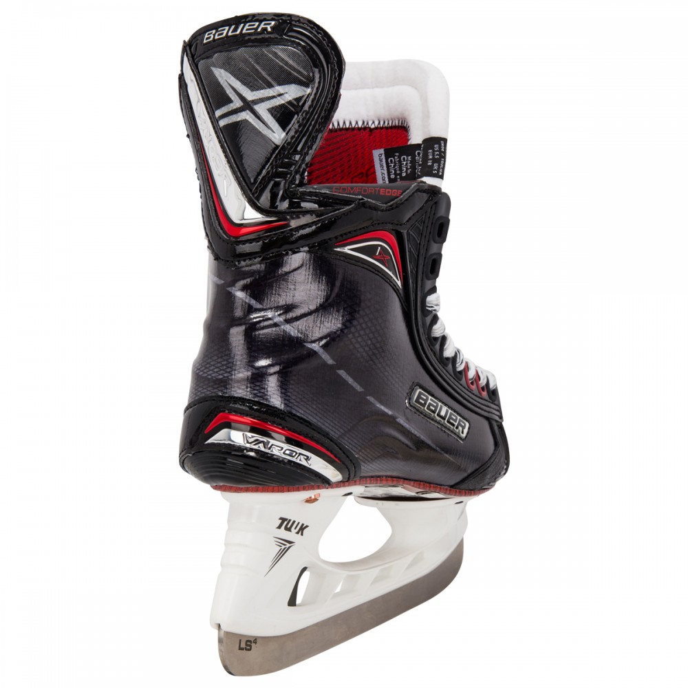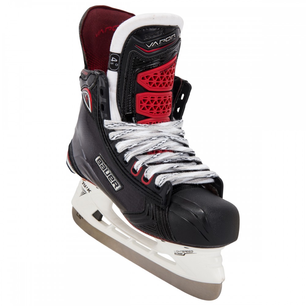 Хоккейные коньки BAUER VAPOR 1X S17 JR юношеская модель профессионального уровня сезона 2017 получила ряд обновлений и снабжена современными, фирменными технологиями. Покрытие корпуса ботинок выполнено из трехмерного, композитного материала 3D lasted Curv, который гарантирует высокую прочность, профессиональную жесткость, отличный уровень защиты и устойчивость. Ботинок полностью термоформируемый, что позволяет получить индивидуальную подгонку по ноге. Крестообразный суппорт X-Rib придает ботинку высокую пространственную жесткость, ботинок меньше деформируется при нагрузке, создается плотная фиксация ноги внутри ботинка, что значительно повышает маневренность игрока. Кромка ботинок имеет специальные накладки Edge Comfort, которые снижают износ верхнего края и повышают комфорт при контакте ноги с краем ботинка. Ботинок имеет встроенную композитную поддержку пятки и лодыжки Curv Composite Support. Новая подкладка Lock-Fit Pro обеспечивает максимальный уровень комфорта, сохраняя ноги сухими, а так же исключает проскальзывание ноги внутри ботинка, способствуя эффективной передаче энергии, позволяя быстро ускоряться. Плотно зафиксировать пятку и голеностопный сустав позволяют внутренние вкладыши, расположенные в области лодыжки и выполненные из пены с эффектом памяти. Внутренний язычок Flex-Lock Pro с защитным элементом плюсневой кости имеет облегченную конструкцию, которая позволяет создать плотную посадку, обеспечивает при этом оптимальную гибкость ноги при движении вперед, исключает сдавливание голеностопа затянутой шнуровкой и создает повышенный уровень защиты от ударов. Толстый слой из белого войлока служит подкладкой внутреннего язычка. Новая система шнуровки Lock-Fit Pro позволяет сохранять оптимальный уровень затяжки шнурков. Вторая и третья проушины имеют Т-образное сечение и не дают затяжке ослабнуть при движении. Термоформируемая, внутренняя стелька Speed Plate улучшает распределение веса хоккеиста по подошве ботинка, способствует лучшей передаче усилия и сохранению устойчивости. Композитная подошва снабжена дополнительными вентиляционными отверстиями. На коньках установлены стаканы Tuuk Lightspeed Edge и лезвия из нержавеющей стали Tuuk LS4 с полированной поверхностью.