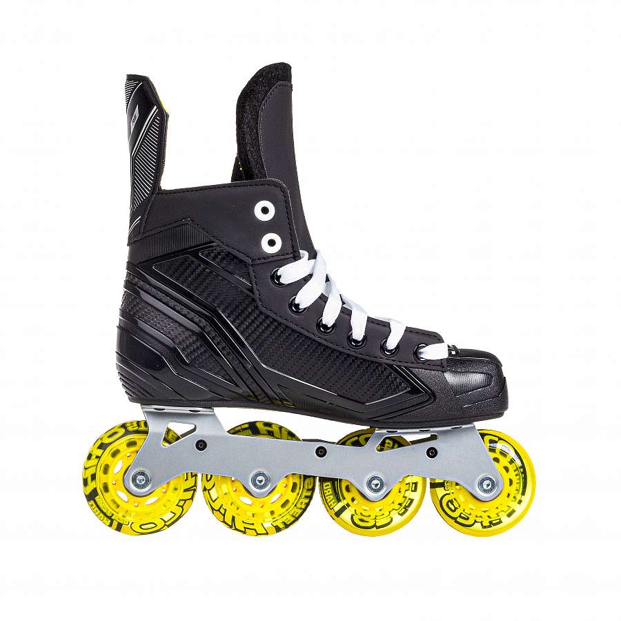 Хоккейные роликовые коньки для уличного хоккея (роллер-хоккея). Отличный выбор для хоккеистов, которые не прекращают тренировки в межсезонье, даже когда лёд растаял. Корпус ботинка конька выполнен из легкого, но очень прочного композитного материала, гарантирующего игроку высокий уровень защиты. Плотная анатомическая посадка обеспечивает оптимальную поддержку и устойчивость стопы. Составной язычок с войлочным покрытием плотно охватывает переднюю часть голеностопа. Вставки высокой плотности создают дополнительную защиту плюсневой кости от травм. Внутренняя подкладка из износоустойчивой микрофибры способствует более эффективной передаче усилия при движении. Стальное шасси Hi-Lo является одним из лучших для роликов на хоккейные ботинки, создавая оптимальный баланс скорости и контроля. Уличные колеса Hi-LO и подшипники Hi-LO ABEC 5 обеспечат вам отличный баланс, контроль и дополнительную прочность.